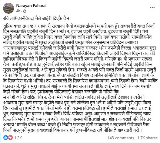 म कोही व्यक्ति लक्षित थिइन, छैन। मेरो व्यक्ति लक्षित नगरिएको उजुरीलाई देखाएर र त्यसैको आधारमा मुद्दा दर्ता गराएर केहीले स्वार्थ पूरा गर्न खोजेका हुन् भने म अहिले पनि उजुरी/मुद्दा फिर्ता लिन राजी छु। हामीले बचत फिर्ता मागेका हौं, यसमा प्रतिवद्ध छौं। हामीले यसलाई समात, उसलाई थुन, त्यसलाई मुद्दा चलाउ भनेका छैनौं। विधि-प्रक्रिया, अड्डा-अदालत र सरकारले पीडितलाई न्याय दिन्छ कि भनेर लामाे समय चुप बसें। न्यायका नाममा पीडितलाई मात्र हाेइन अन्यलाई पनि निरन्तर अन्याय भएपछि बाेल्न बाध्य भएकाे हुँ। निर्दोष फसाएर दोषी उम्काउने र सहकारी पीडितको पैसा फिर्ता पाउनुपर्ने मुख्य सवाललाई विषयान्तर गर्ने दुष्कर्मविरुद्ध सबै पीडितले खबरदारी गराैं ।