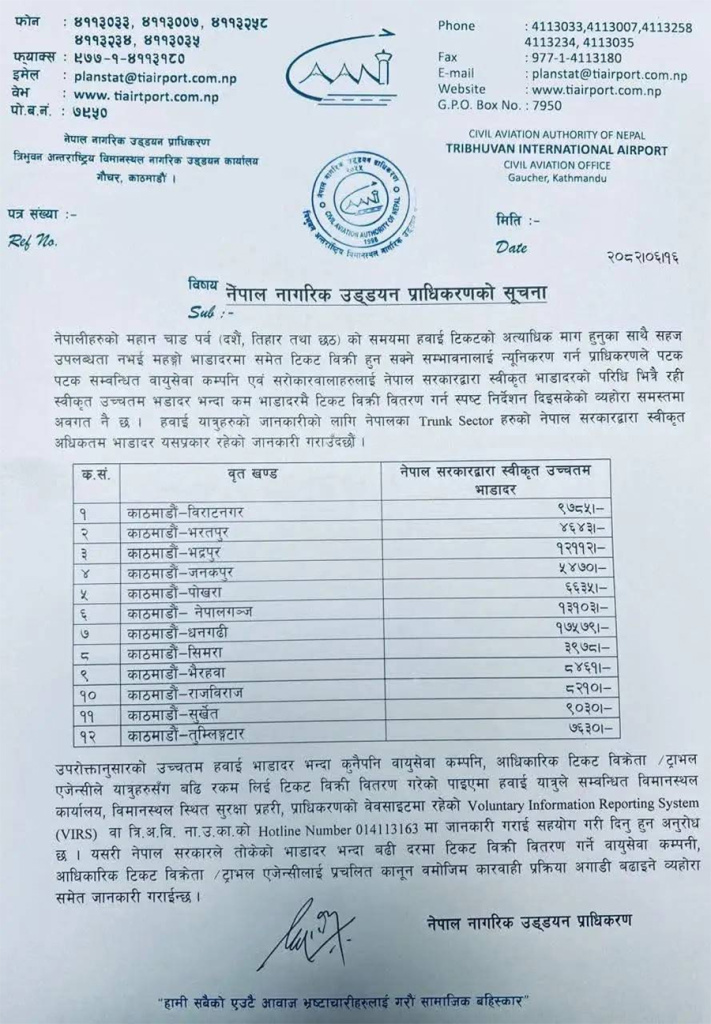 चाडपर्वको बेला वायु सेवा कम्पनीहरूले मनपरी भाडा उठाउनेक्रम रोक्न प्राधिकरणले अधिकतम भाडा सीमा निर्धारण गर्दै, त्यसभन्दा बढी शुल्क लिने कम्पनीलाई कारबाही गरिने चेतावनीसमेत दिएको छ।
